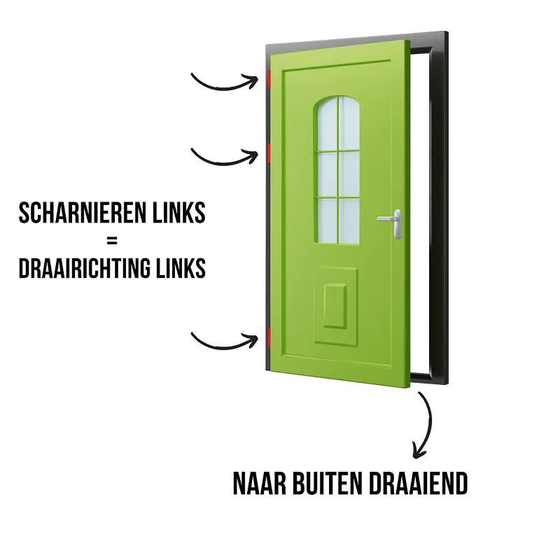 Hiernaast ziet u een voorbeeld foto van een naar buiten draaiende deur. De scharnieren zitten aan de linkerzijde. Dit is dus een links draaiende deur.